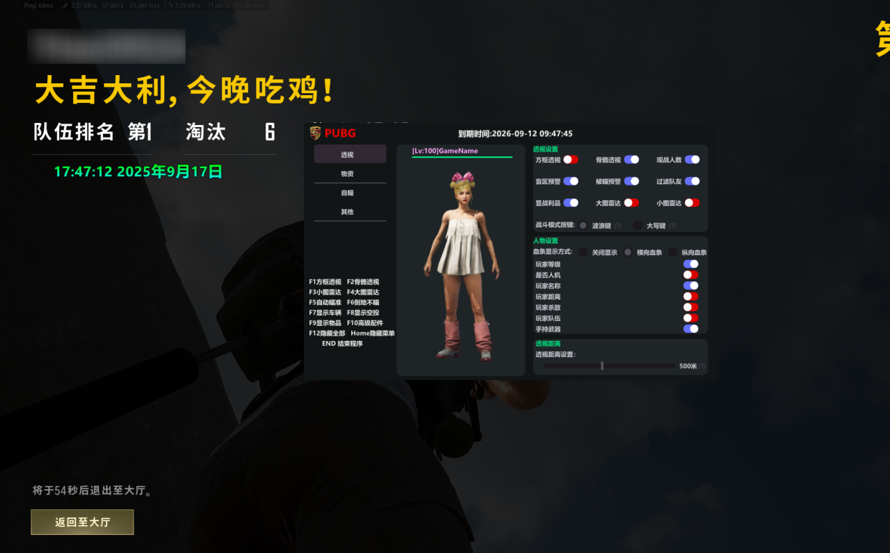 功能介绍:透视.自瞄.大小地图雷达.物质显示 支持系统:W10-W11 注意:每一局,出生地或落地必须按一次P键才有效果!不按没效果! 注:游戏必须无边框 注:无记忆功能,退游戏要重新开 辅助价格:8.8/8小时/18/天